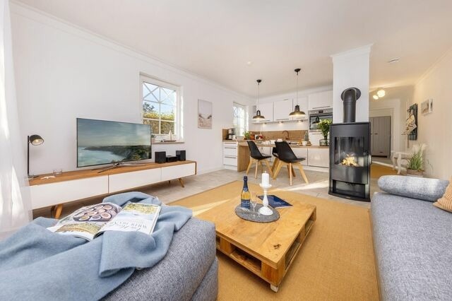 Kurzbeschreibung: Die komfortable Ferienwohnung Dynamique in Zingst bietet bis zu 3 Personen modernen Komfort, eine überdachte Terrasse, einen Gaskamin und Nähe zu Strand und Freizeitangeboten der ideale Ort für erholsame Urlaubstage. Lagebeschreibung: Die Ferienwohnung Whg. Dynamique befindet sich in ruhiger Lage in der Friedenstraße in Zingst, nur etwa 750 Meter vom feinsandigen Ostseestrand und 1000 Meter zum Boddenhafen entfernt. In der unmittelbaren Umgebung sind ein Supermarkt (ca. 100 Meter) und verschiedene Restaurants (ca. 200 Meter) schnell erreichbar. Die Region bietet zahlreiche Freizeitaktivitäten wie Beachvolleyball, Wassersport, Minigolf und Wandern. Wellnessangebote und kulturelle Veranstaltungen wie Kino und Theater bereichern den Aufenthalt. Für Familien stehen Aktivitäten wie Reiten und Bootsausflüge zur Verfügung. Die zentrale Lage gewährleistet eine einfache Anreise, während ein eigener Parkplatz in der Tiefgarage und ein Fahrradabstellraum mit Lademöglichkeit für E-Bikes zusätzlichen Komfort bieten. Ausstattungen: Die Wohnung Whg. Dynamique in Zingst bietet auf 55 m² modernen Komfort für bis zu drei Personen. Der offene Wohn- und Essbereich zeichnet sich durch ein hochwertiges Sofa, das auch als Schlafsofa (150x200) genutzt werden kann, sowie eine digitale Unterhaltungsausstattung mit Fernseher, HiFi-Anlage und Blu-ray-Spieler aus. Eine moderne, allergikerfreundliche Ausstattung wird durch Fliesenböden und Fliegengitter ergänzt. Die voll ausgestattete Küche mit Induktionsherd, Backofen, Kühlschrank mit Gefrierfach und Geschirrspüler lädt zu gemeinsamen Kochabenden ein. Im separaten Schlafzimmer steht ein Doppelbett (180x200) und ein großer Kleiderschrank zur Verfügung. Das Badezimmer ist mit einer bodengleichen Dusche ausgestattet. Zudem bietet die Wohnung eine Nutzungsmöglichkeit für eine Waschmaschine und einen Fahrradabstellraum mit Lademöglichkeit für E-Bikes in der Tiefgarage.